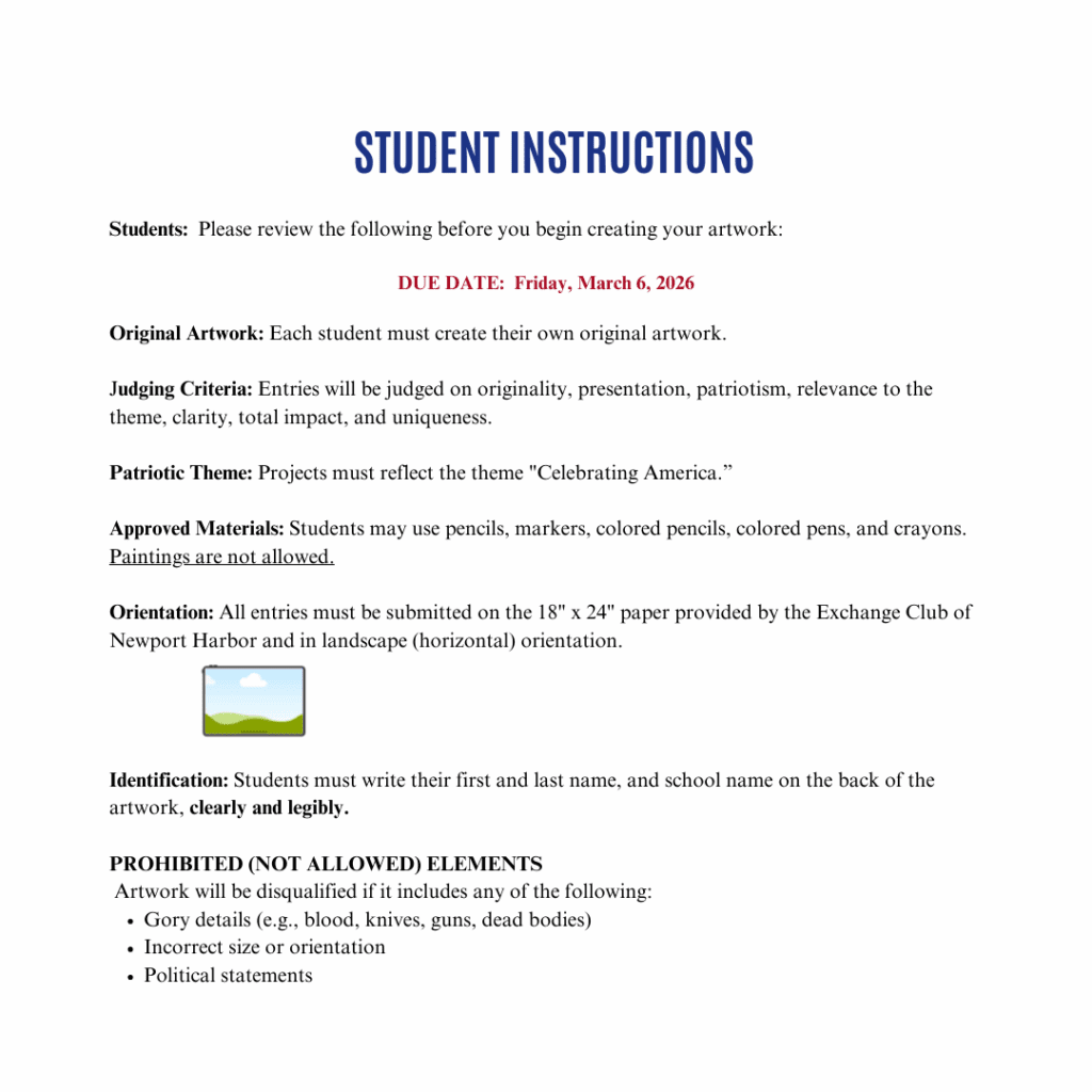 3. Patriotic Theme: Projects must reflect the theme “Celebrating America.” Celebrate what makes America special—its history, symbols, heroes, values, and the diverse people who make our communities strong. Students can depict freedom, unity, courage, or the future of our nation. Use your creativity to share your personal vision of the spirit of America!