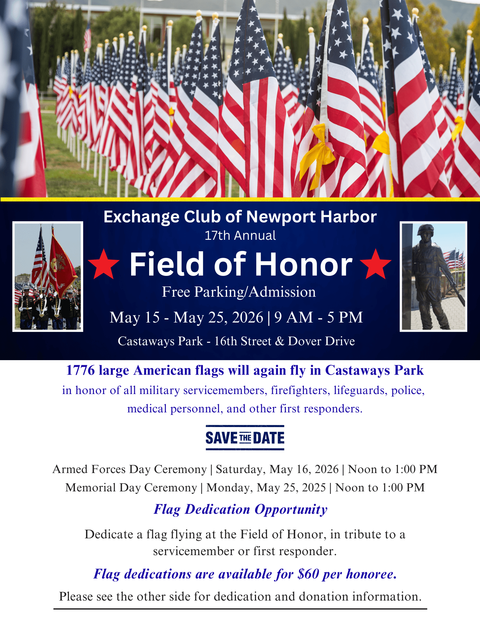 Each flag you dedicate is yours to keep and is available for pickup at the Field of Honor from 8:00 AM to 12:00 PM on Tuesday, May 26, 2026.