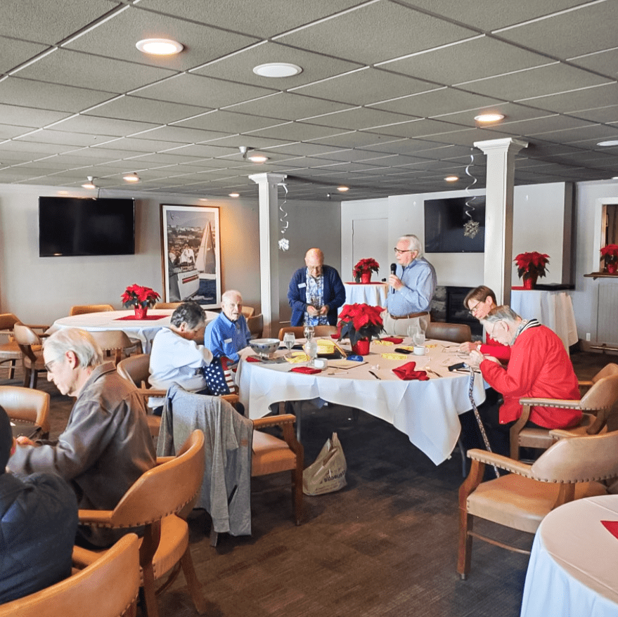 Last week’s luncheon was held in the lower dining room at the Newport Beach Yacht Club, and 20 members were in attendance. President Ken DuFour opened the meeting with an invocation, asking the Lord to intervene on behalf of Marj Collins, who is presently in hospice, and to give us His blessings for her physical, emotional and psychological well-being. On a lighter note, Ken asked for lots of snow in Mammoth so that our Secretary, Richard Swinney, would be able to enjoy skiing in Mammoth this coming weekend. Richard responded by leading the salute to Old Glory. Lunch served this week served as a buffet, consisted of a greesn salad, chicken breast with sliced tomatoes, mashed potatoes, and grilled vegetables. Yummie!