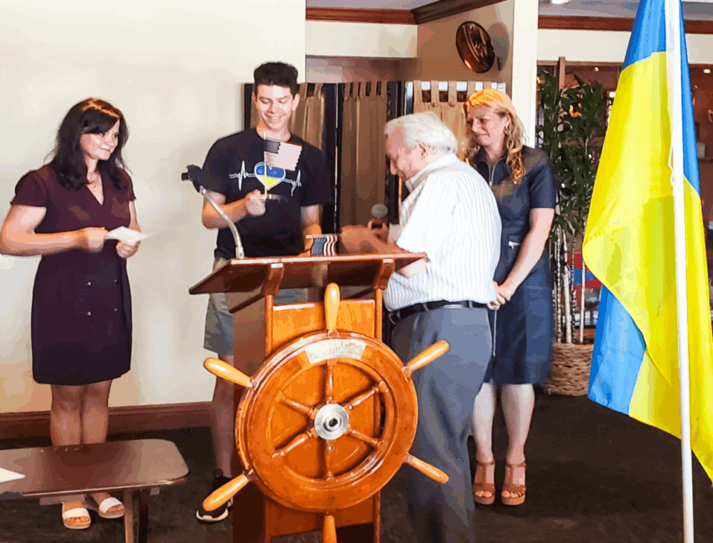 There were a total of 37 who had lunch at the BCYC in celebration of Spouses Day this week: 26 of whom are members. Five spouses in attendance were Ron Lashmett, husband of Shirley; Bob Kinton’s wife, Lore; Mary Romeo, wife of Ed Romeo; Jody Swinney, spouse of our Secretary, Richard; and Jeanne Nininger, wife of Jerry. Also having lunch were Tom Bowers, guest of Scott Terry; Bonnie Barrington, widow of Bob Barrington, who was a long-term member of ECNH and guest of Mary and Ed Romeo; John Morgan, who is an honored guest of George Lesley; and our very special guests, Marina Medinska and Max O staff, members of a family from the Ukraine, along with their sponsor, Victoria Gillis, who were our featured speakers for the day. Outgoing Pres. Mike Gertner opened the meeting; our Treasurer Dr. Bob Wood provided the opening prayer; and Dave Schapiro led the group in the Flag Salute. Lunch ensued.