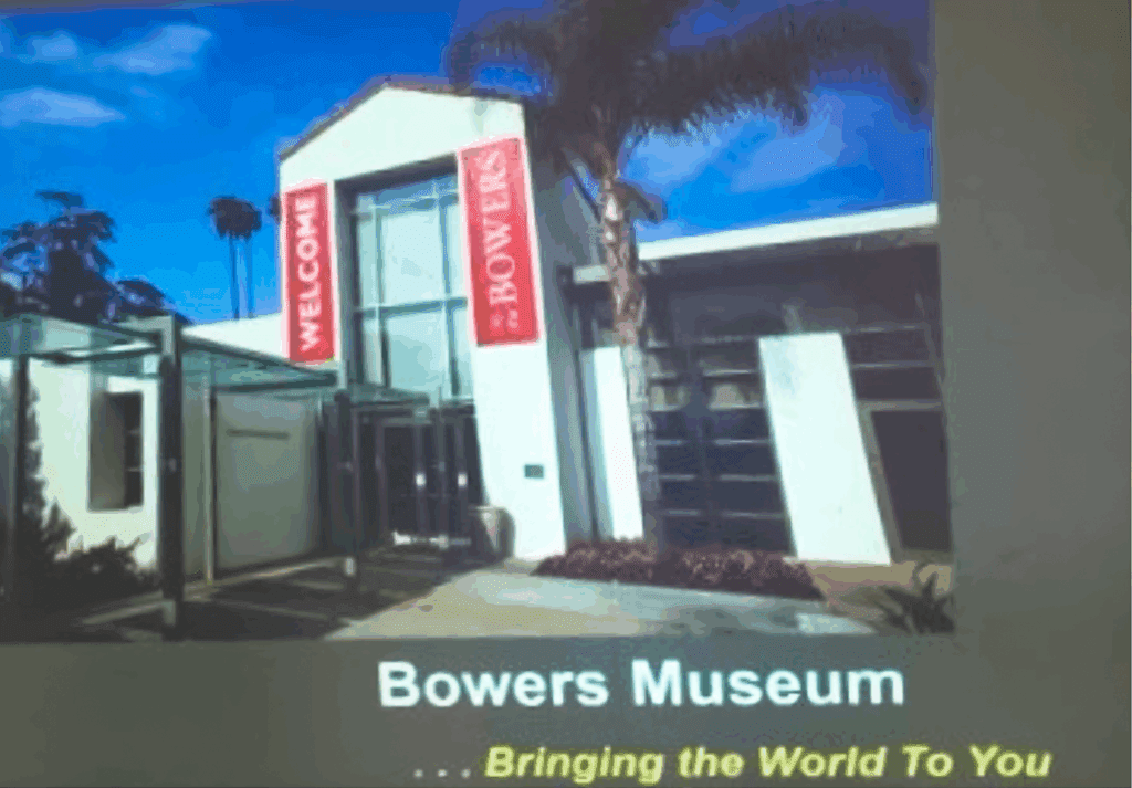Christine presented several other activities that are offered at Bowers. The docents operate a Book Club, and their featured book for April is “First Blush: People’s Intuitive Reactions to Famous Art, by Dan Hill”. Another program of note is their “Distinguished Lecture Series“, which is presenting “Legendary Authors and the Clothes They Wore with Terry Newman”. Past programs of this series have included “Archeology of the Biblical Lands presented by Dr. T. Levy”, a presentation of the archeological digs in Israel.
