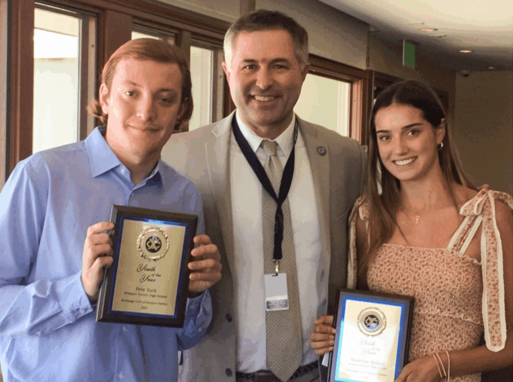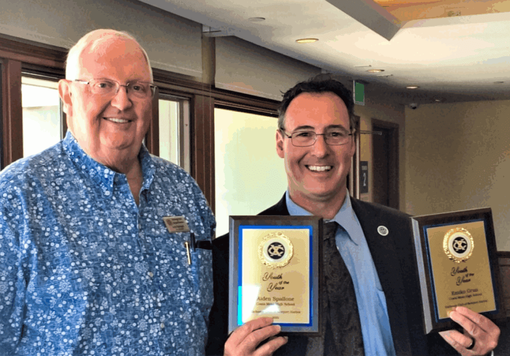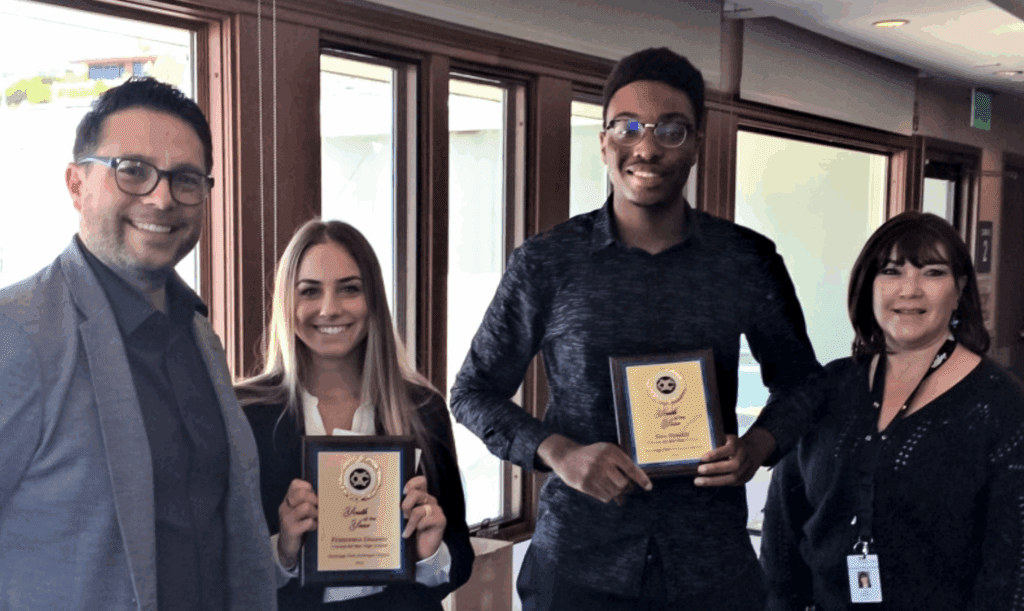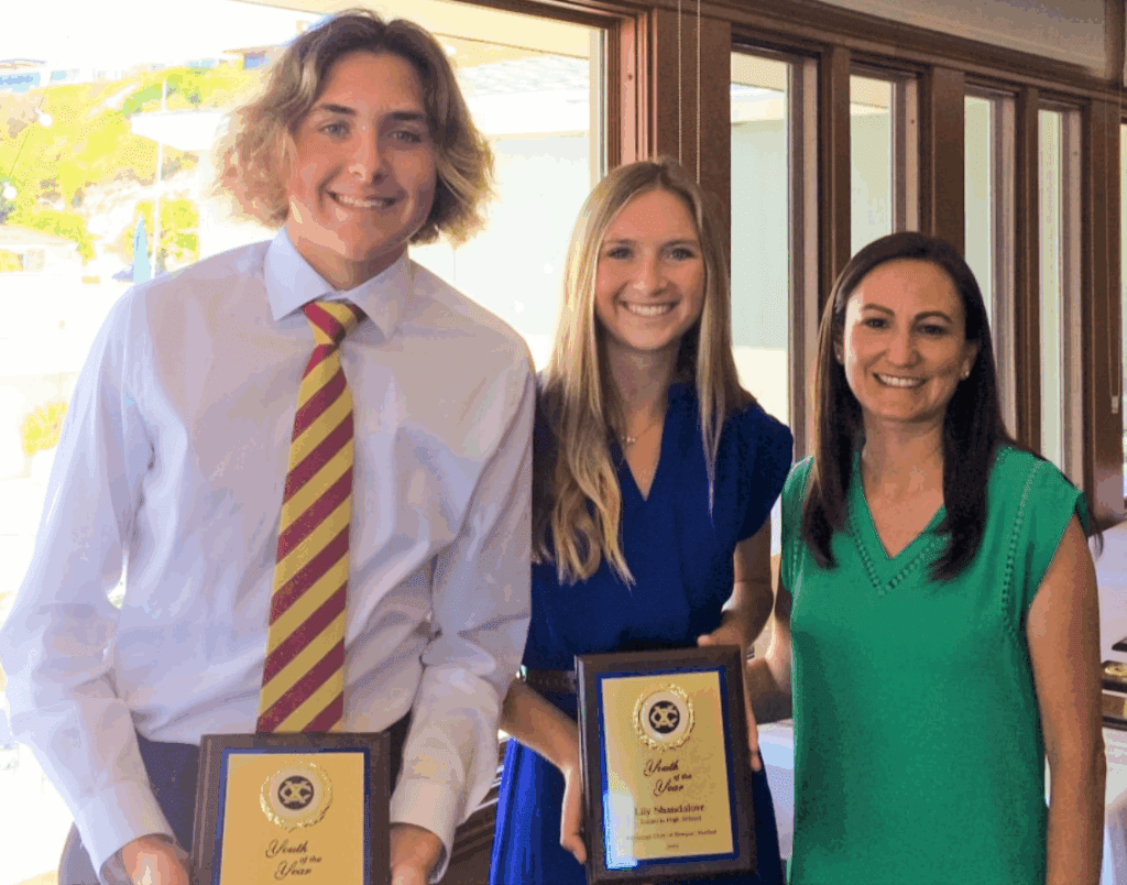 From Estancia High School, counselor Carrie Smith is shown with Lily Shandalove, who played volleyball, ASD President, Best Buddy, medical academy and is going to UC Berkeley, Dane Dodge saw his kid brother win a dictionary for the patriotic essay at Victoria from our Exchange Club. Water polo captain, ASD Treasurer, Best Buddies Club VP, He will be going to Cal Poly SLO to study investment technology. (Mike Gertner commented that his own son got an award from Estancia of maybe $200 25 years ago.)